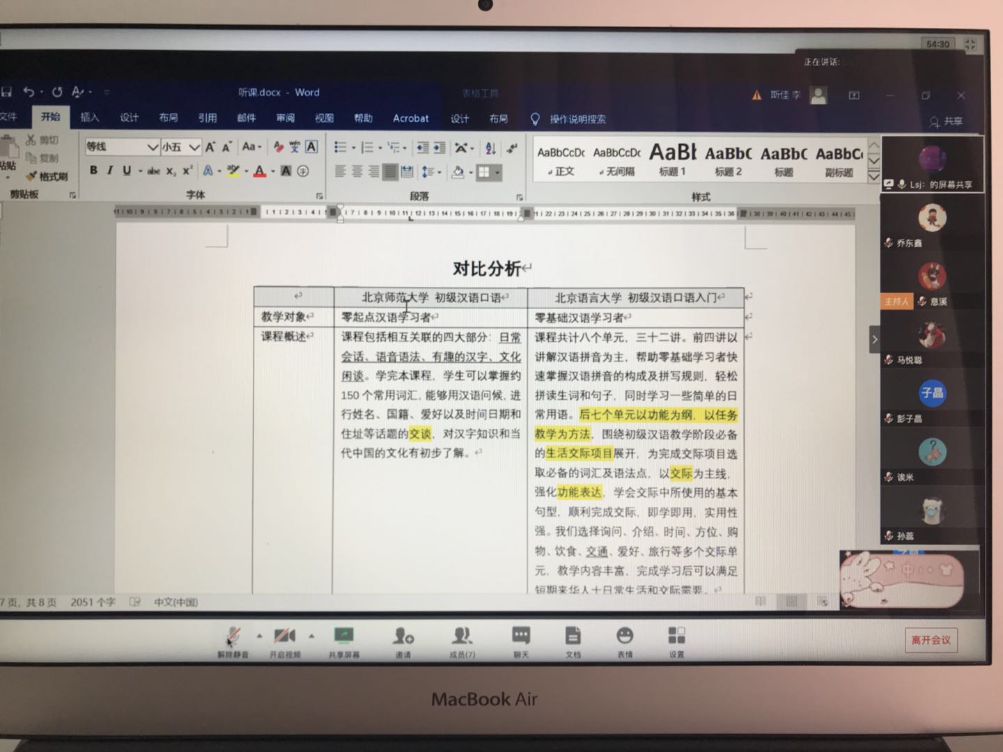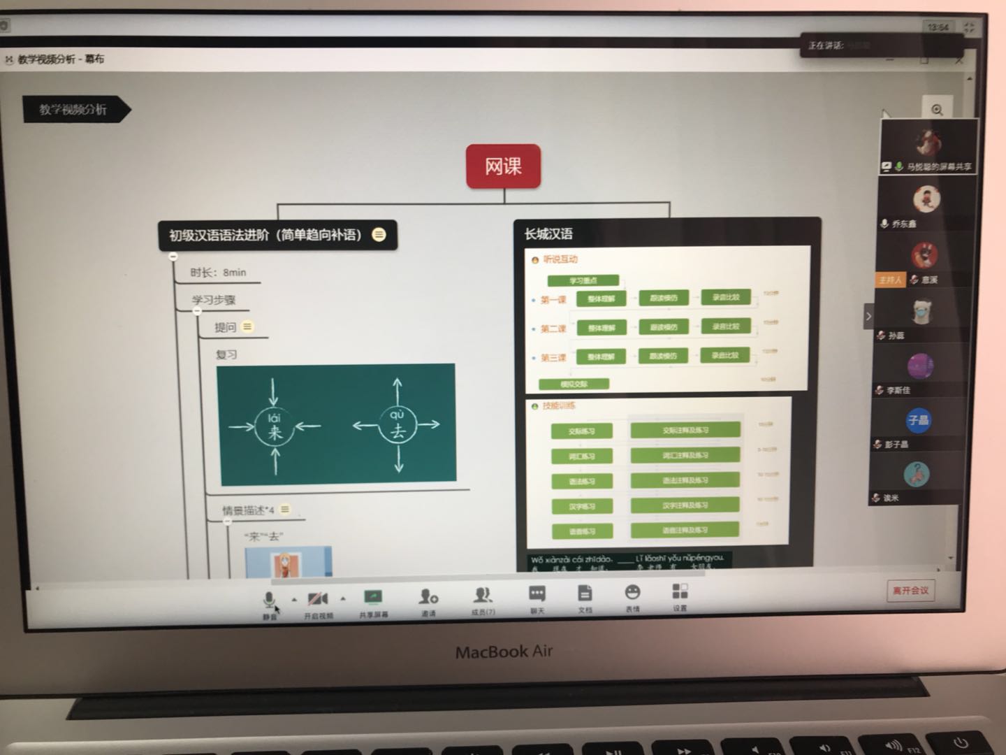 在居家防疫大环境下,线上学习成为最主要的教学方式。教育实习的听课观摩也搬到了线上。指导教师通过建立实习微信群,布置实习安排,明确实习要求,并提供学习视、听、音、影资源。员工利用互联网等现代教育技术手段,查阅国际汉语教学理论、教学设计、教学案例等方面的文献资料;通过超星、中国大学MOOC、学堂在线等慕课平台体验网络汉语课程教学模式;观摩优酷、哔哩哔哩等视频网站的中外汉语教学视频实录;研究各级各类各课型教材编写体例、特点特色等,开阔视野,积累教学体悟。