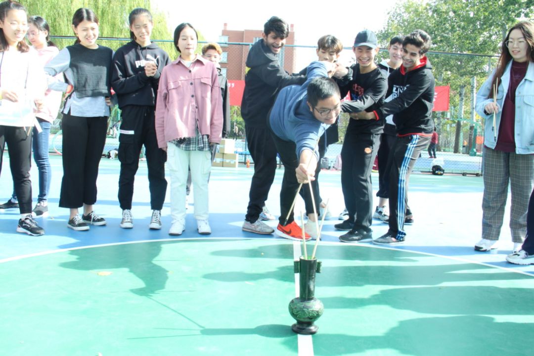 还记得《醉翁亭记》中大宴宾客时“射者中”的场景吗,没错,就是投壶!不过传统士大夫的雅致,被我们北体学子玩出了花样。你以为运动只靠身体嘛,错了,还有创新思维!看看大家的脑洞,为了离壶更近一点,大家也是蛮拼的。