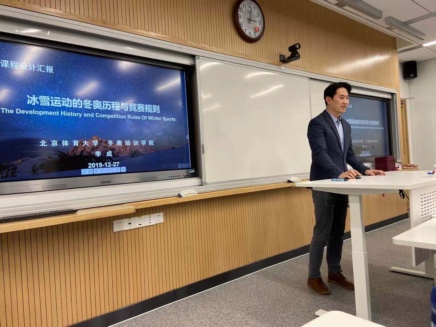 继续教育学院季成博士汇报的题目是《冰雪运动的冬奥历程与竞赛规则》