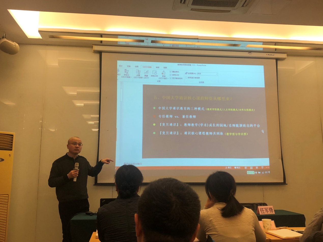 24日下午,复旦大学通识教育中心副主任、政治学系教授任军锋为老师们带来了“教师如何享受课堂”的讲座。主要围绕“中国大学通识课程的团队从哪里来”、“以学术为天职者的双重角色”、“聚焦经典文本之通识核心课程面临的主要挑战”、“通识核心课程:不是通识概论课”等问题展开。任军锋教授主要讲述教师应如何带领员工由点到面、由表及里地“进入”与“走出”经典文本,应怎样享受课堂。