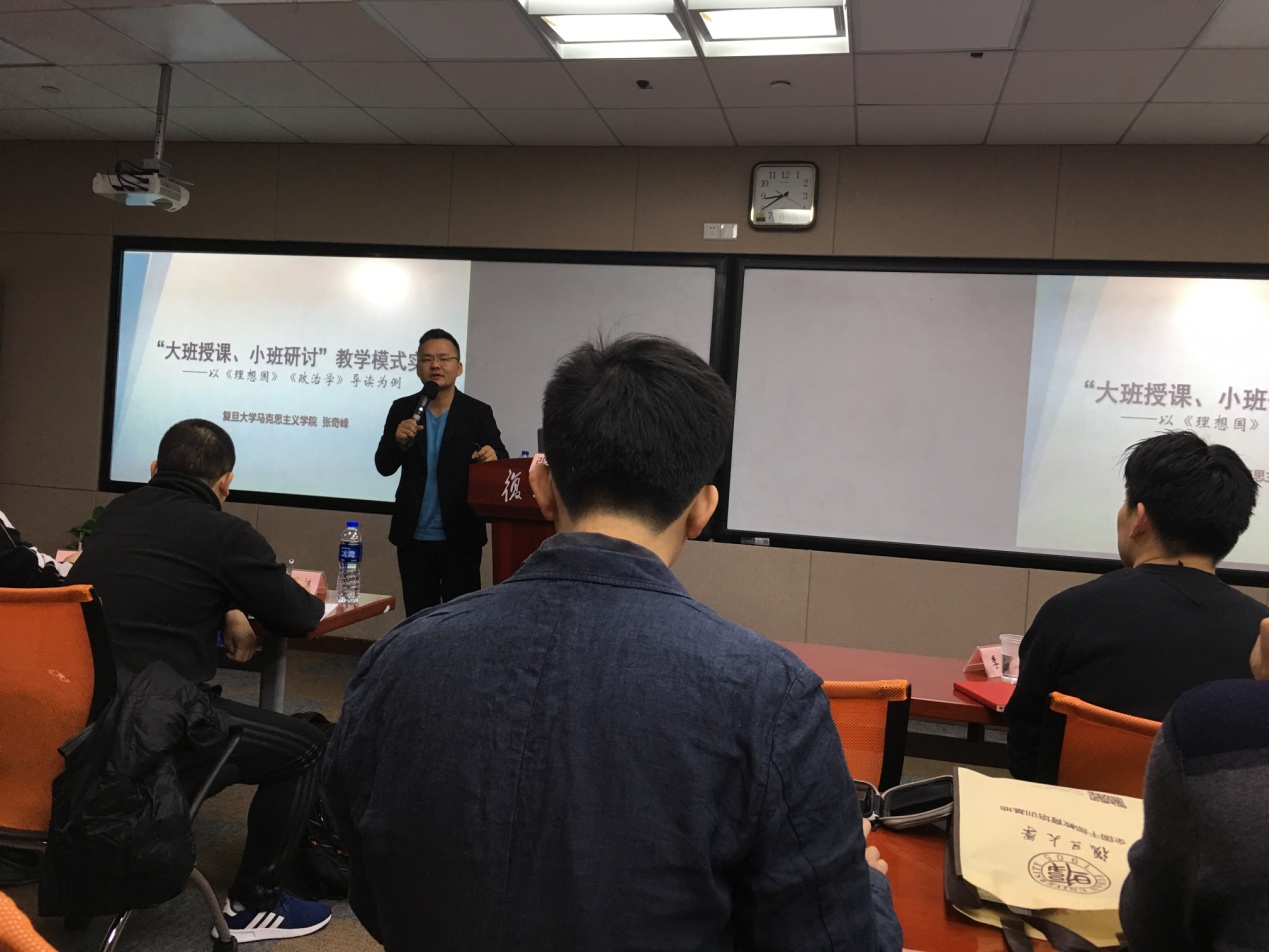 25日上午一共有四场讲座分享:复旦大学马克思主义学院副教授张奇峰作了题为“‘大班授课,小班研讨’教学模式实践——以《理想国》、《政治学》导读为例”的讲座。围绕“如何有效开展经典文本教学”、“如何契合员工的现实需求”、“如何激发员工的主动学习能力,可迁移的核心能力”等问题展开论述。张奇峰老师强调“大班授课”要尽可能有详尽地教学设计,“小班讨论”要有讨论班的流程设计。