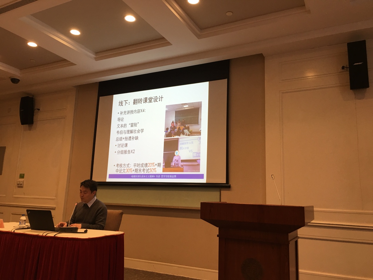 复旦大学哲学学院副教授郁喆隽作题为“如何来上一门文史经典课——以《新教伦理与资本主义精神》导读为例”的报告。郁喆隽老师指出这门课程2015年以来使用慕课(MOOC)结合翻转课堂方式授课,单周上实体课堂或翻转课堂,上周同学自行上慕课网站,观看教学视频,做在线试题,参与在线讨论。将一门传统的文史经典导读类课程打造成线上与线下相结合的混合式教学模式。慕课加翻转课堂,消除“舞台假相”,坚持不迎合、不谄媚员工、学术为本的原则。让员工成为课程内容的创造者。