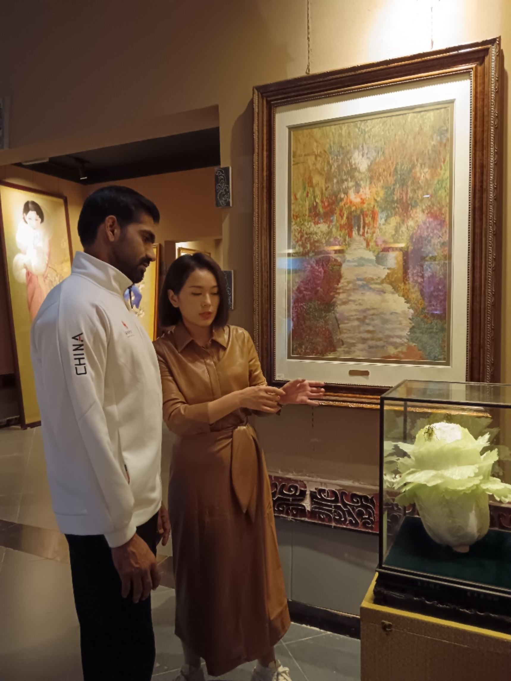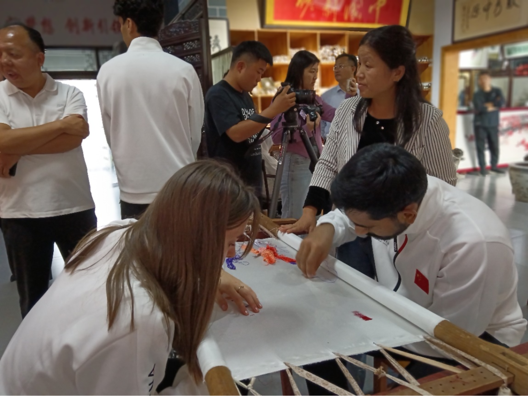 北体文化考察团师生先后参观了安绣的直销展厅、精品展示厅、绣工车间等地。看着绣工们埋头认真地绣制,职工也忍不住体验了一下这项传统工艺的魅力。