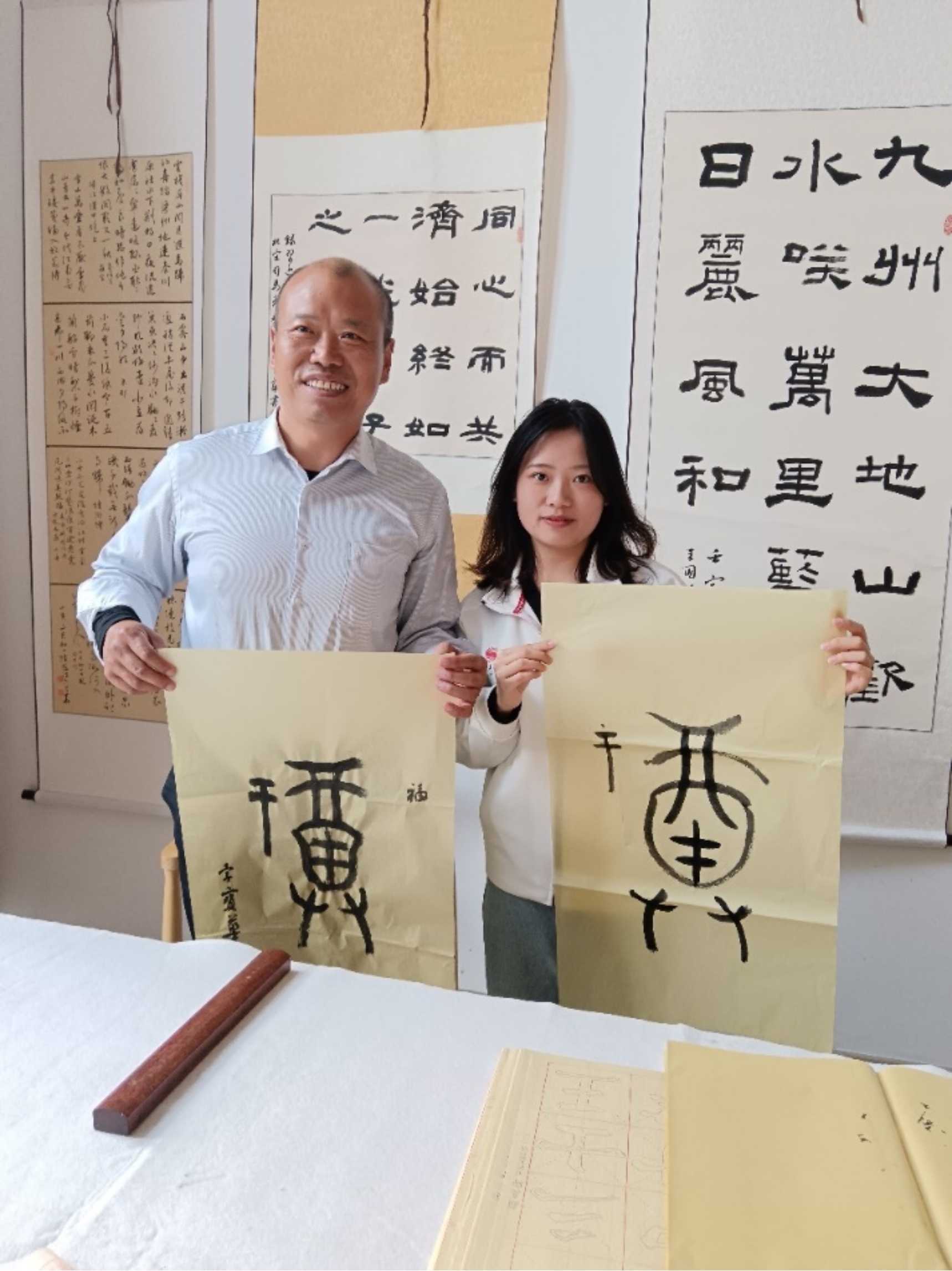在中国书法艺术体验环节,新闻传播学院的越南职工禄碧桃同学因对中国的“福”文化十分感兴趣,现场向书法大师请教学习书写各种字体的“福”字,最后大师还赠与其一副手稿、一沓稿纸,这样碧桃同学回校后仍能继续学习。