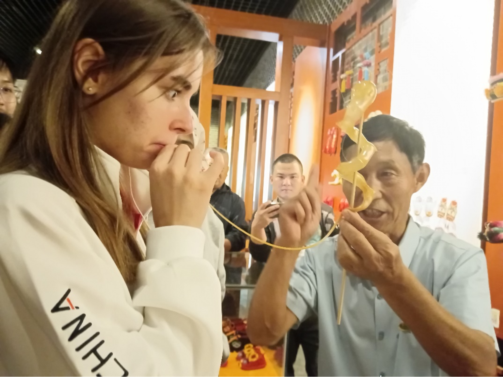 职工一行来到大王庙文化园,职工们在非物质文化遗产展厅,观看了吹糖人的传承人动作娴熟地吹制出各种活灵活现的小动物,并获得了为自己量身定制的生肖糖人。