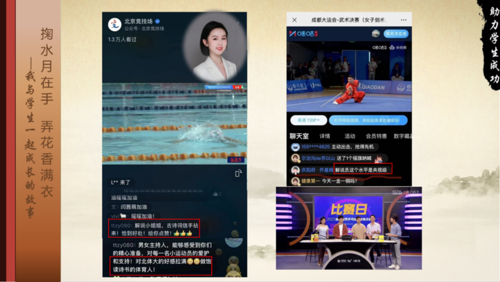 助力员工成功——综合能力的培养。王娜老师在给体育赛事解说专业授课时,和员工一起探索诗意解说,同学们直播解说时不断被点赞,诗意的解说赢得了众多好评。王老师说深刻体会到了助力体育,在体育中传播中国文化的成就感。