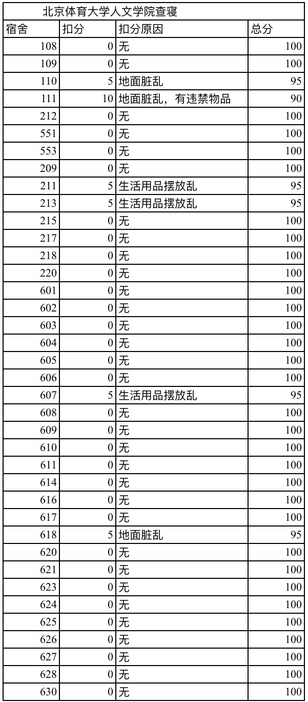从检查结果来看,大家的寝室卫生状况普遍较好,只有部分宿舍有扣分现象,其他宿舍都获得了满分。恭喜大家通过了本次考核,希望获得满分的寝室继续保持,也希望有扣分现象的寝室及时改进。