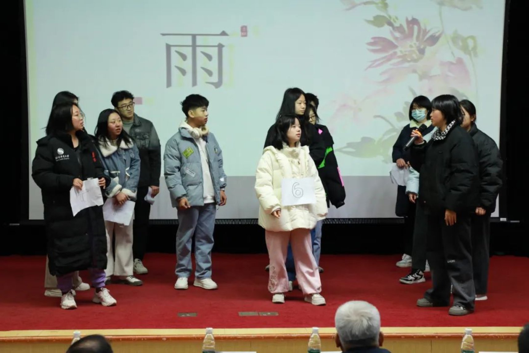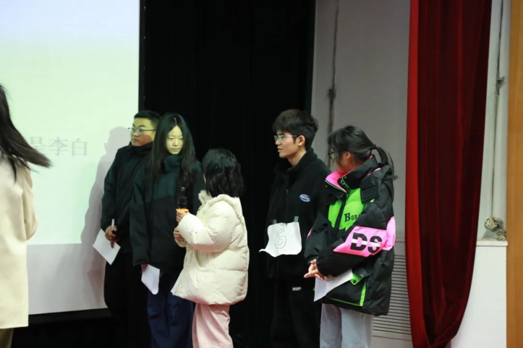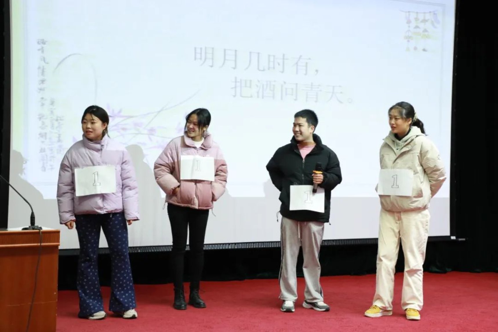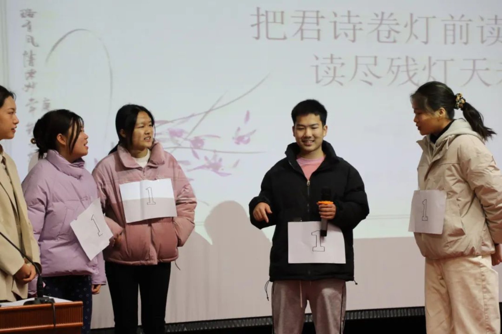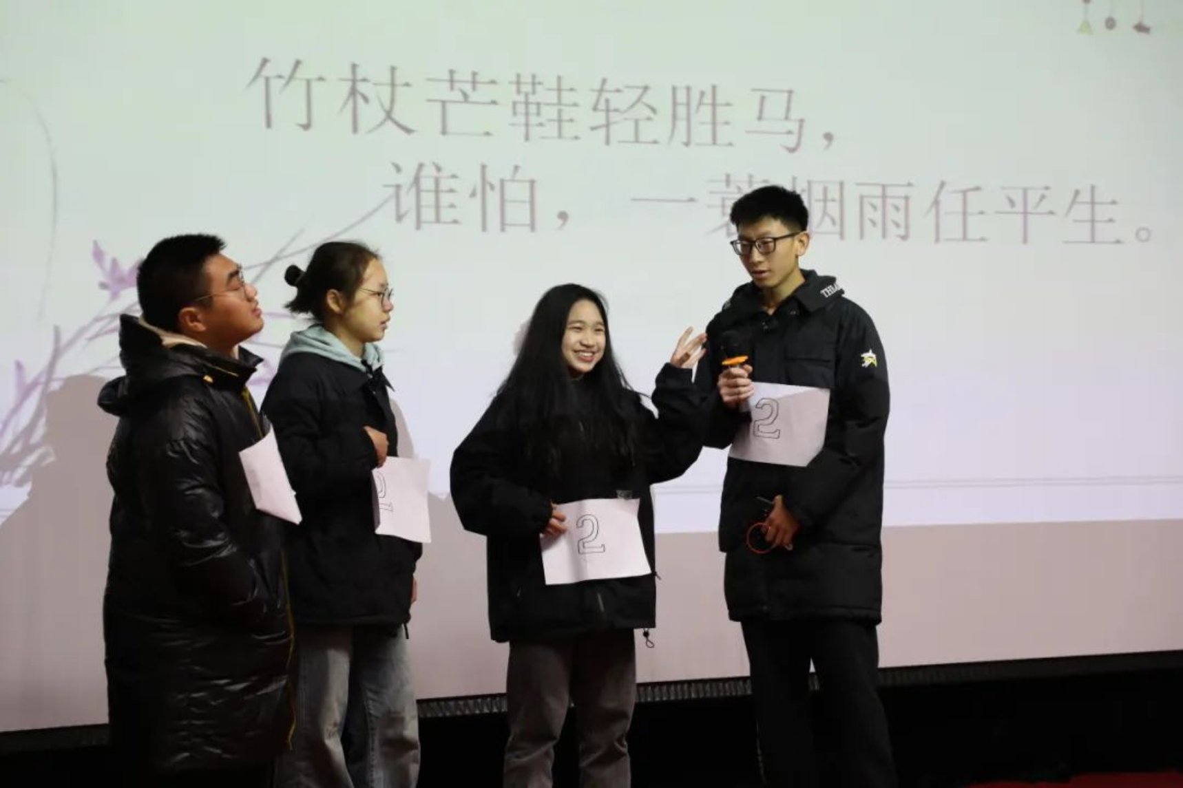 各个参赛组派出代表抽签,参赛者从所抽到诗句的最后一个字开始接龙,可以同字,也可以同音,答出一句加一分。在这轮比赛中,同学们纷纷发力,展示出自己惊人的诗词储备量,斩获不少的分数。台上同学们精彩的表现不仅让台下的同学们惊叹连连,更是赢得了评委们热烈的掌声,现场的气氛达到了高潮。