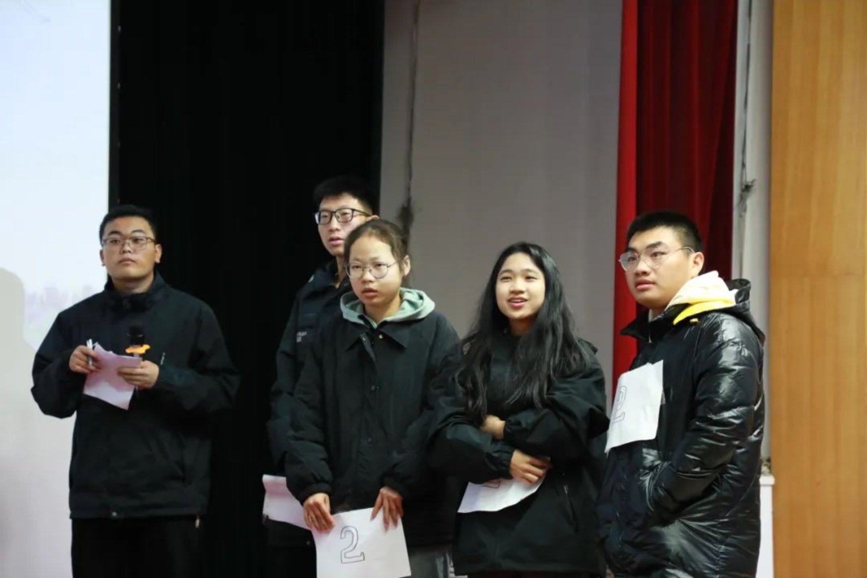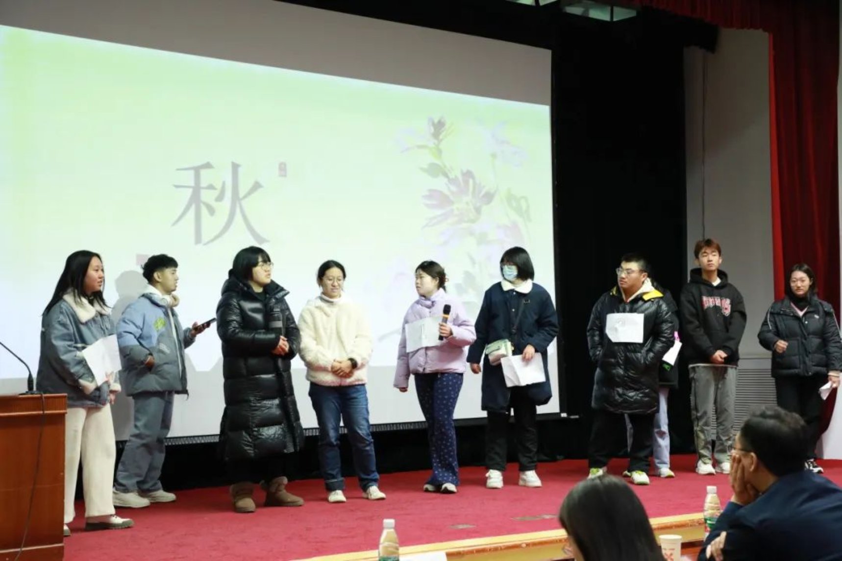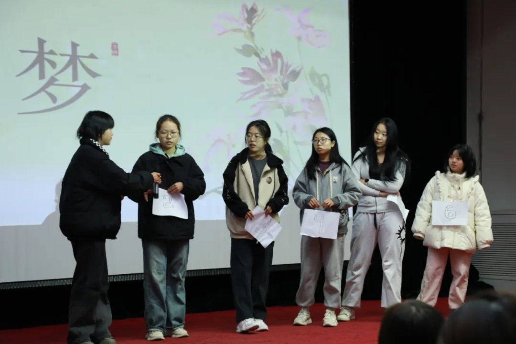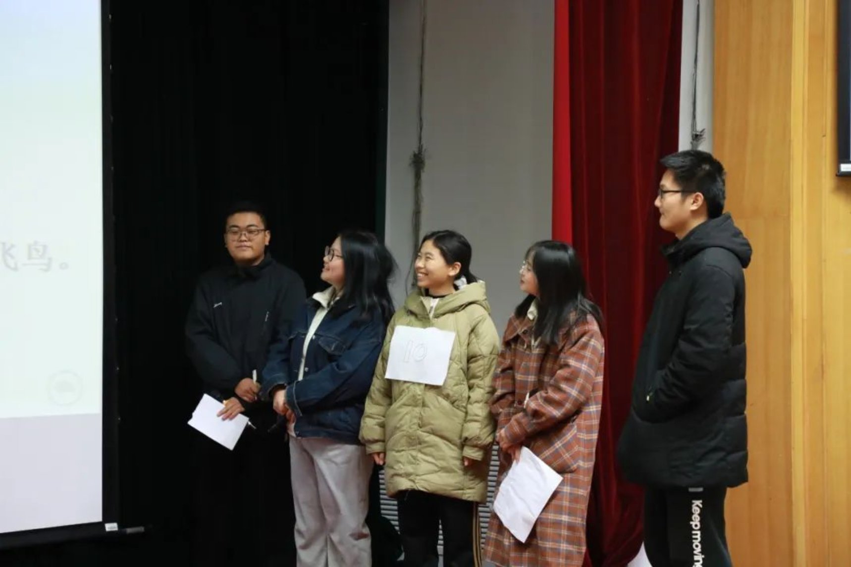 各个参赛组派出代表抽签,参赛者从所抽到诗句的最后一个字开始接龙,可以同字,也可以同音,答出一句加一分。在这轮比赛中,同学们纷纷发力,展示出自己惊人的诗词储备量,斩获不少的分数。台上同学们精彩的表现不仅让台下的同学们惊叹连连,更是赢得了评委们热烈的掌声,现场的气氛达到了高潮。