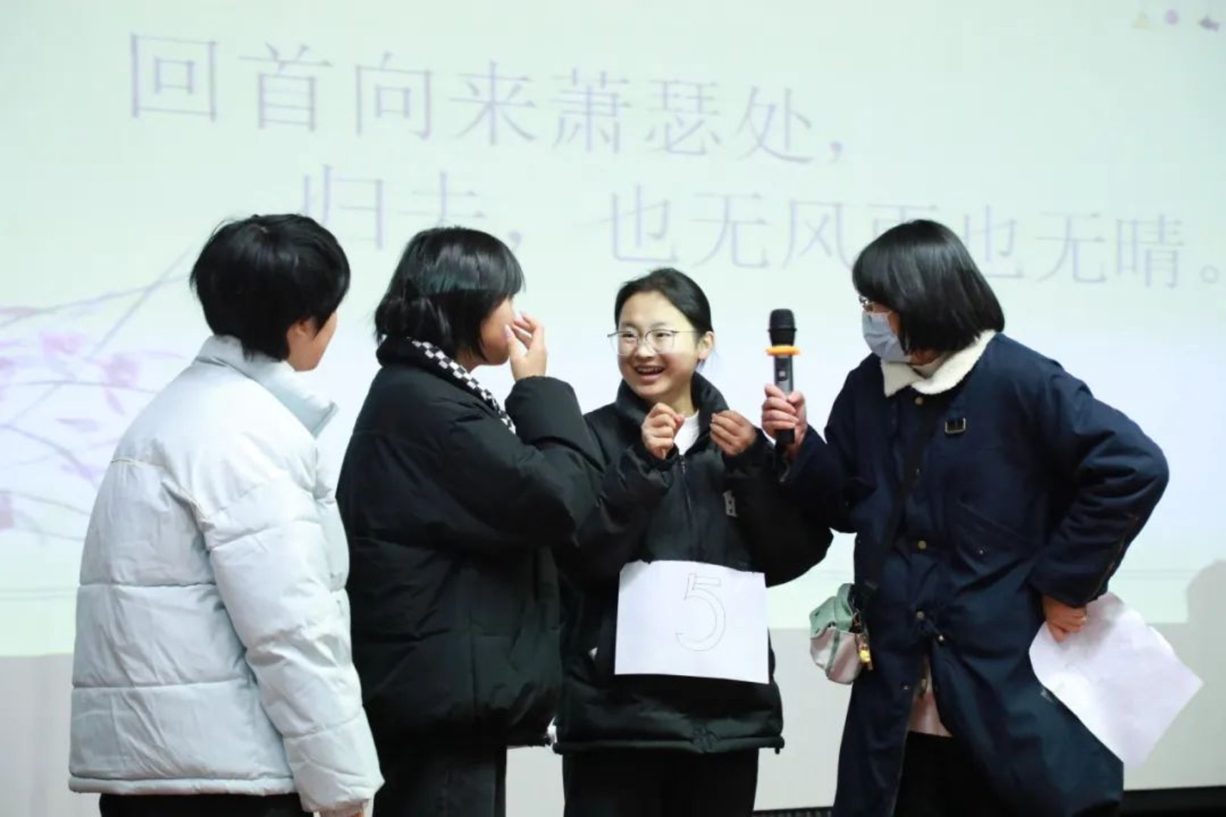 主持人依次播放了五首由诗词改编的歌曲,同学们由一开始的不在状态逐渐到胸有成竹,抢答的速度越来越快,甚至只是听了一句歌词就猜出了诗名。