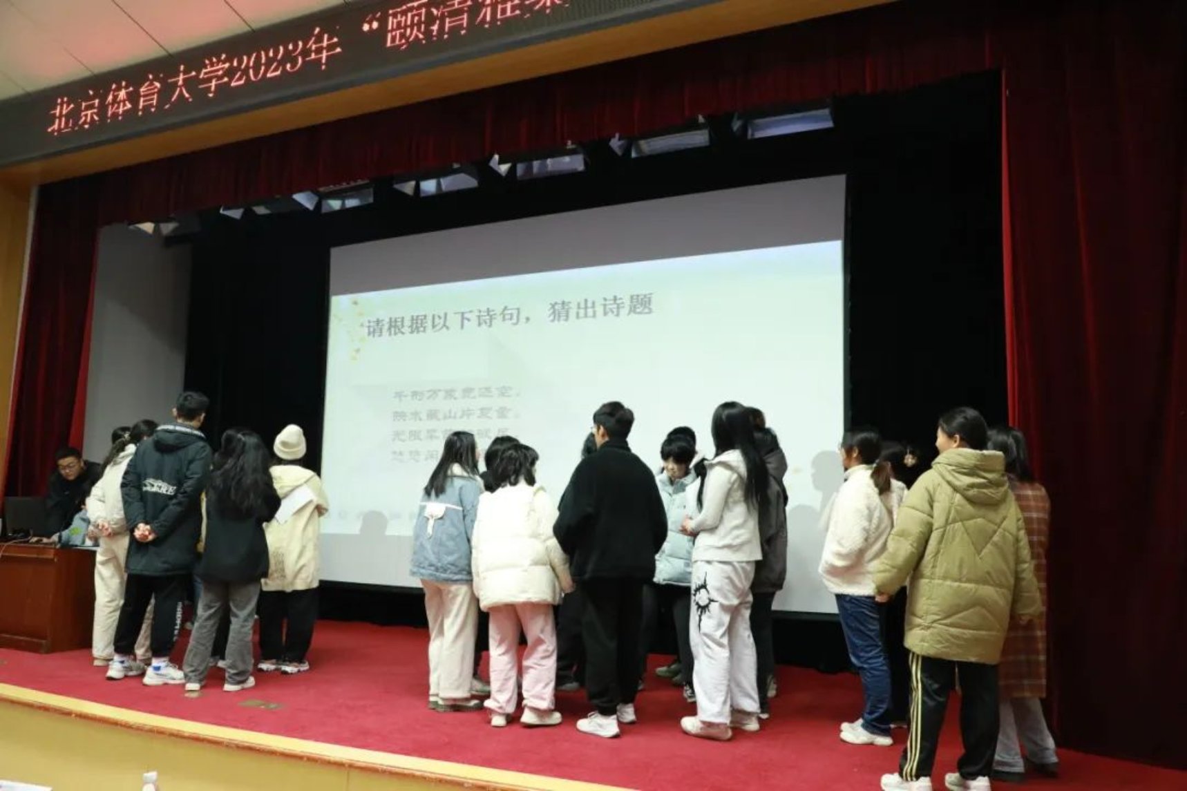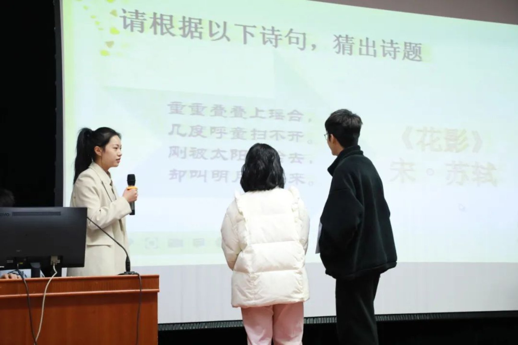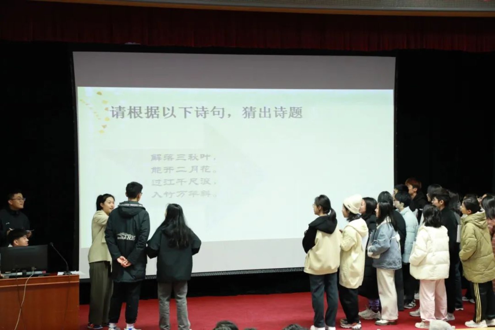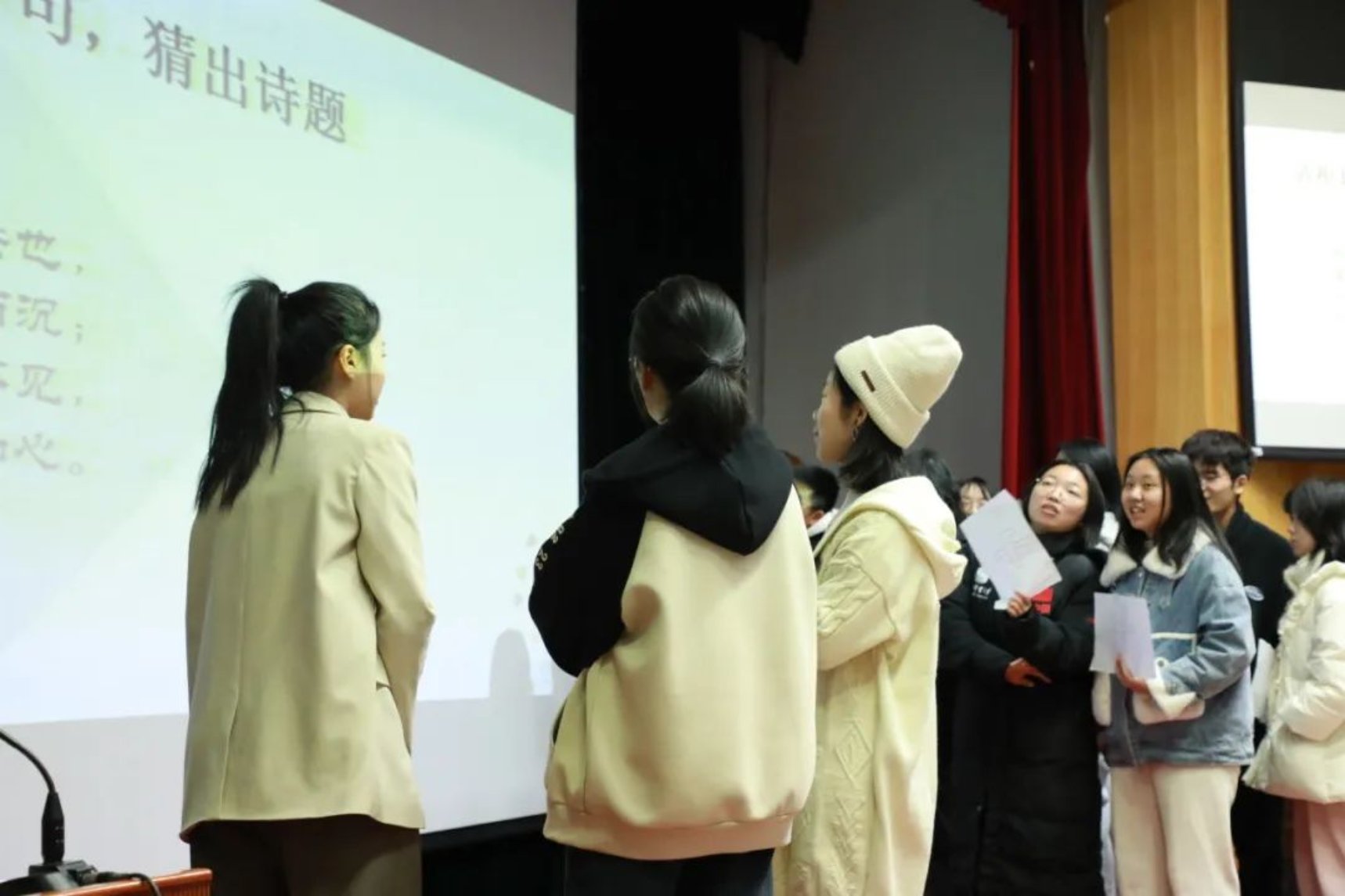 本轮比赛的规则是:每组根据逐条揭示的信息, 猜出诗词或是诗人并抢答。随着主持人逐条揭开提示,现场同学们的声音此起彼伏,纷纷根据线索,抽丝剥茧,推理出该题的正确答案。台上的同学们看着屏幕上的线索,急得直敲脑袋,台下有的同学猜出来答案,挥舞着双手向台上队友比划,场面好不热闹。这项比赛,不仅考察了同学们的诗词储备,同时也考察了同学们对诗人与诗歌常识的了解,可谓一箭双雕。