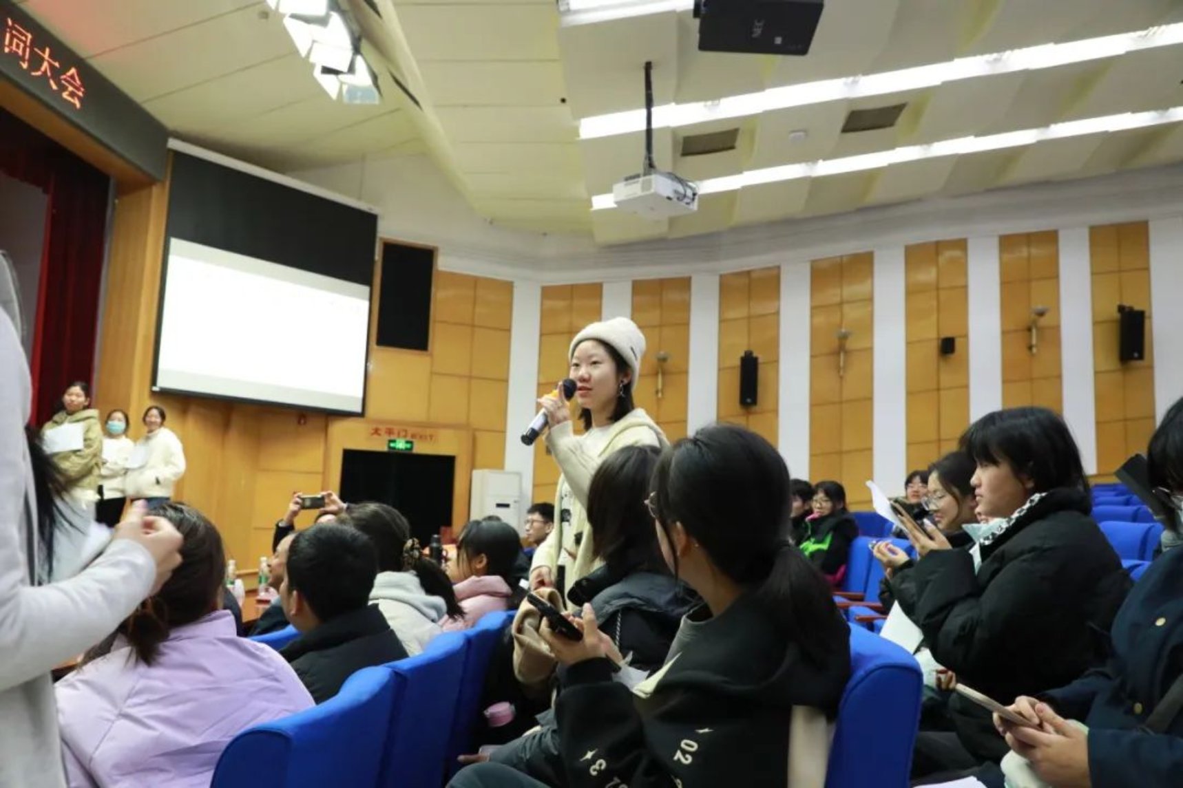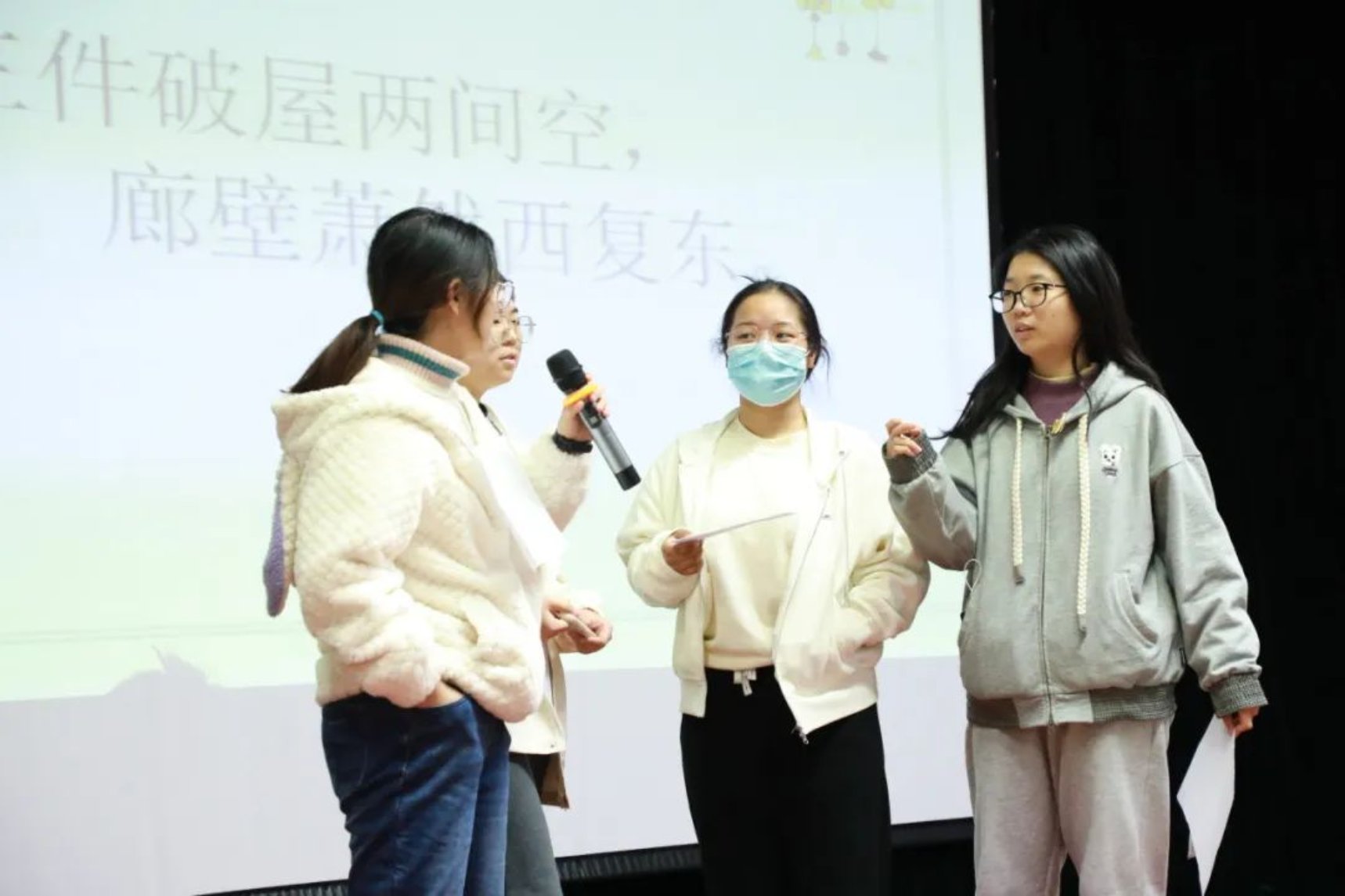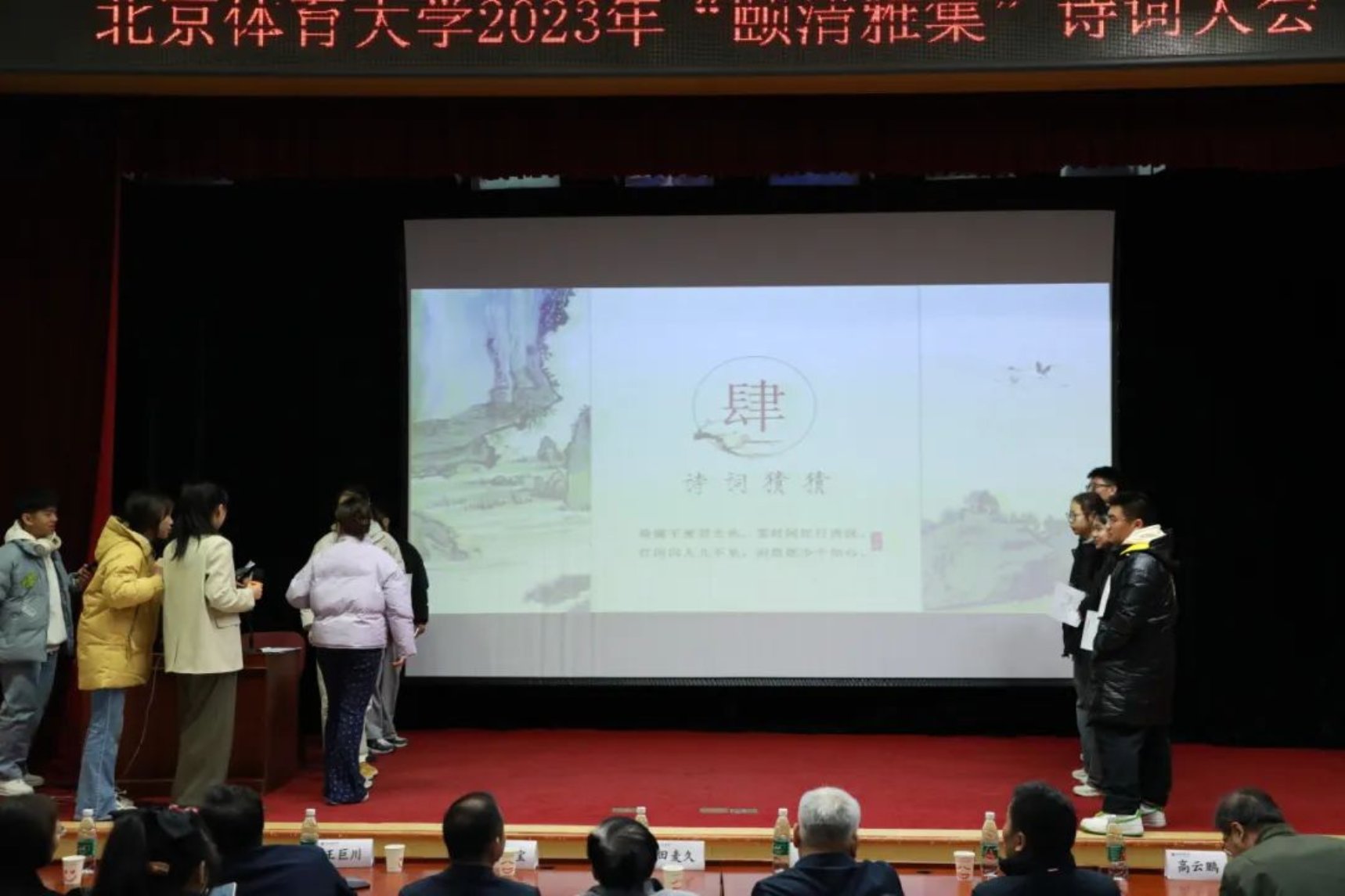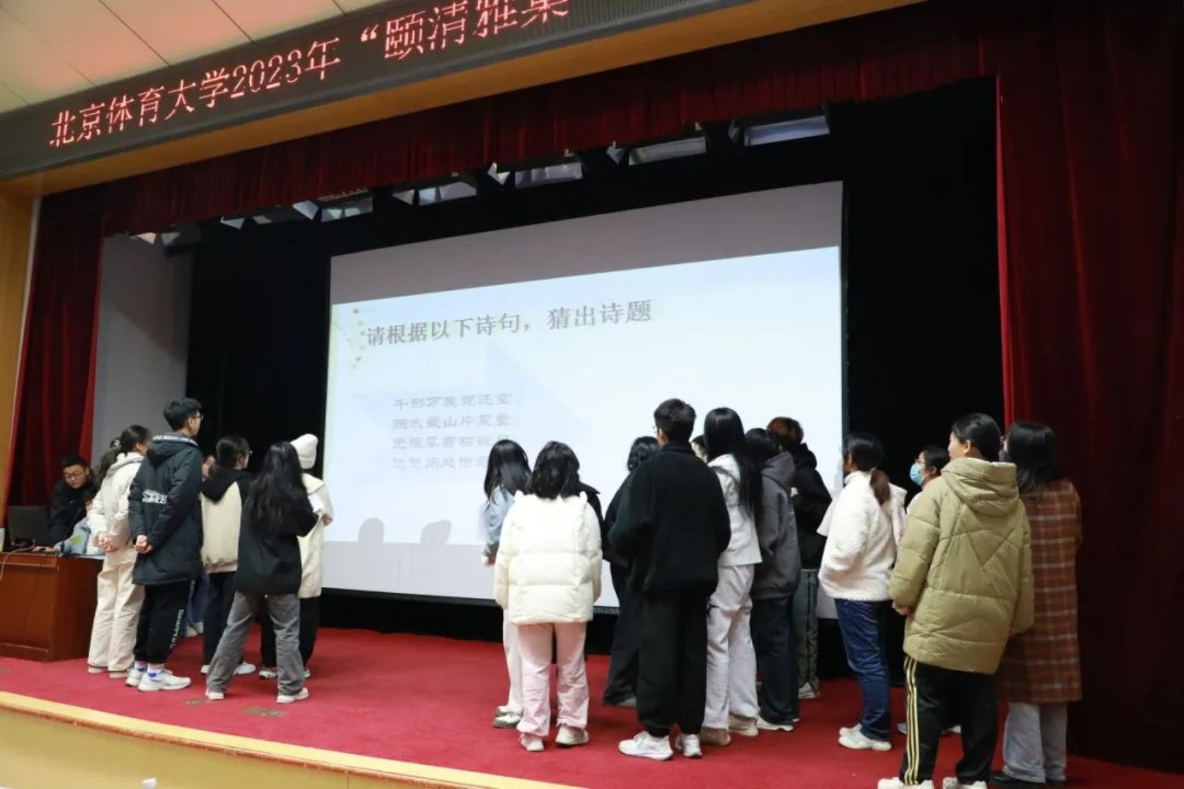 本轮比赛的规则是:每组根据逐条揭示的信息, 猜出诗词或是诗人并抢答。随着主持人逐条揭开提示,现场同学们的声音此起彼伏,纷纷根据线索,抽丝剥茧,推理出该题的正确答案。台上的同学们看着屏幕上的线索,急得直敲脑袋,台下有的同学猜出来答案,挥舞着双手向台上队友比划,场面好不热闹。这项比赛,不仅考察了同学们的诗词储备,同时也考察了同学们对诗人与诗歌常识的了解,可谓一箭双雕。