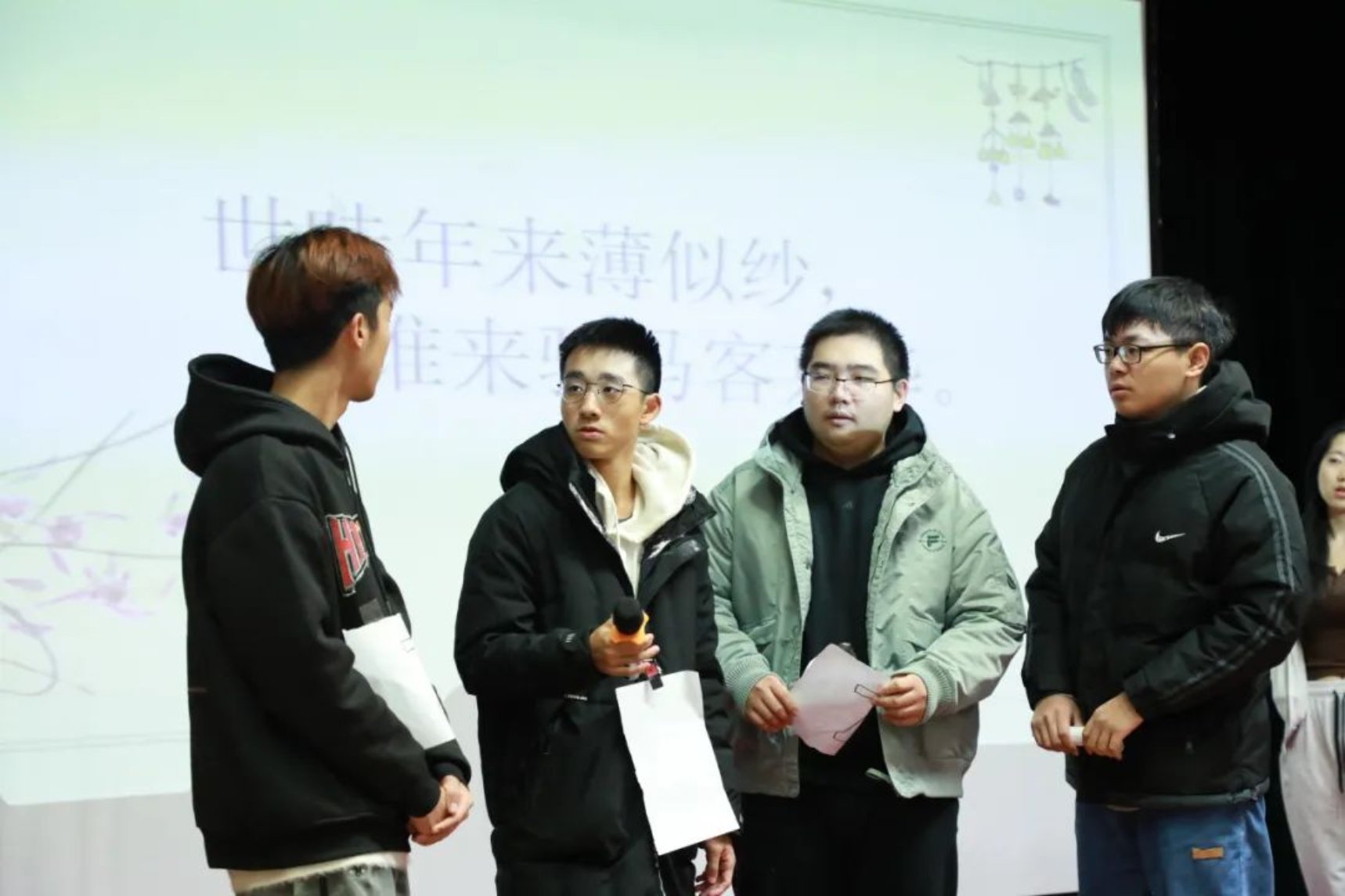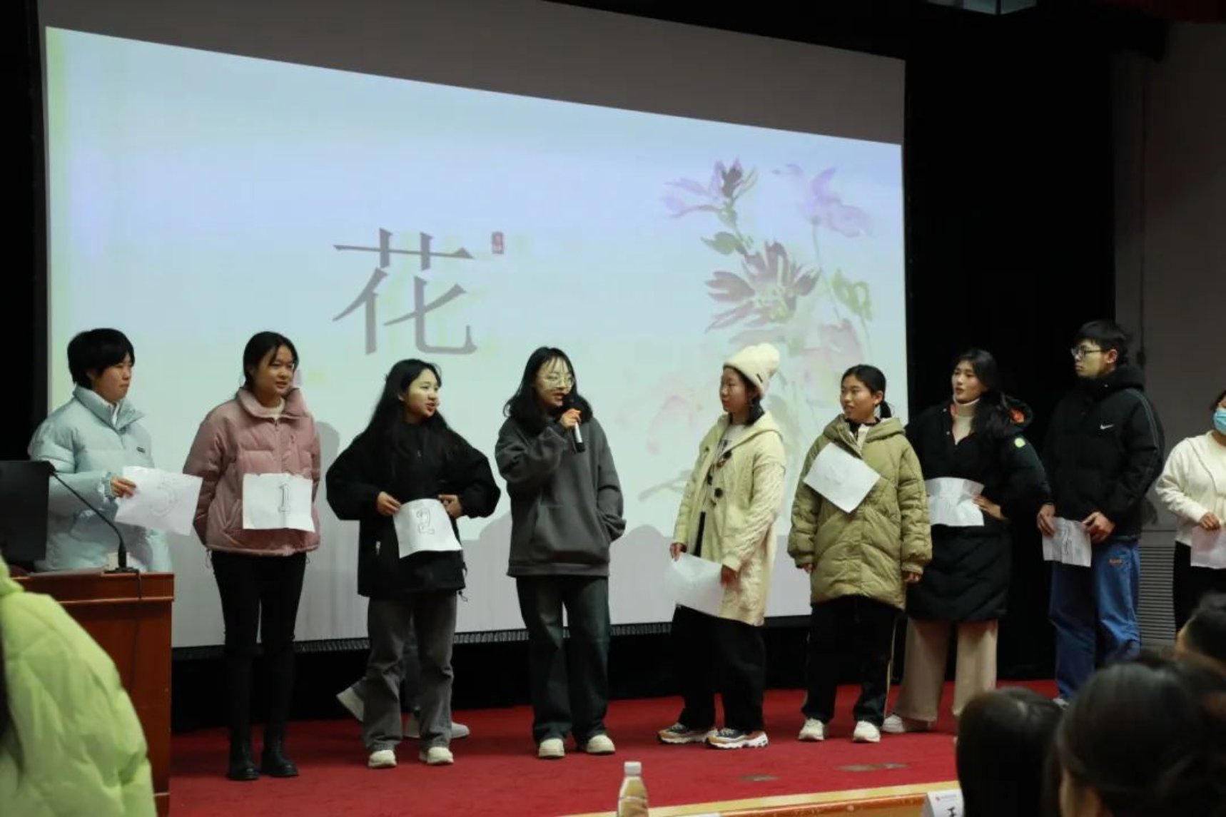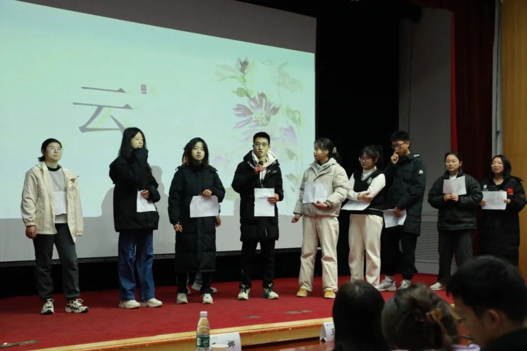 想必大家都对诗词大赛的传统——飞花令并不陌生。每组定好作答顺序后,根据主持人所出题目作答。台上的同学们都卯足了劲儿,从自己充满智慧的大脑中提取有效诗词。台上话筒越传越快,被淘汰的小组越来越多,各位选手一展才情,情洒潘江,各倾路海云尔。
