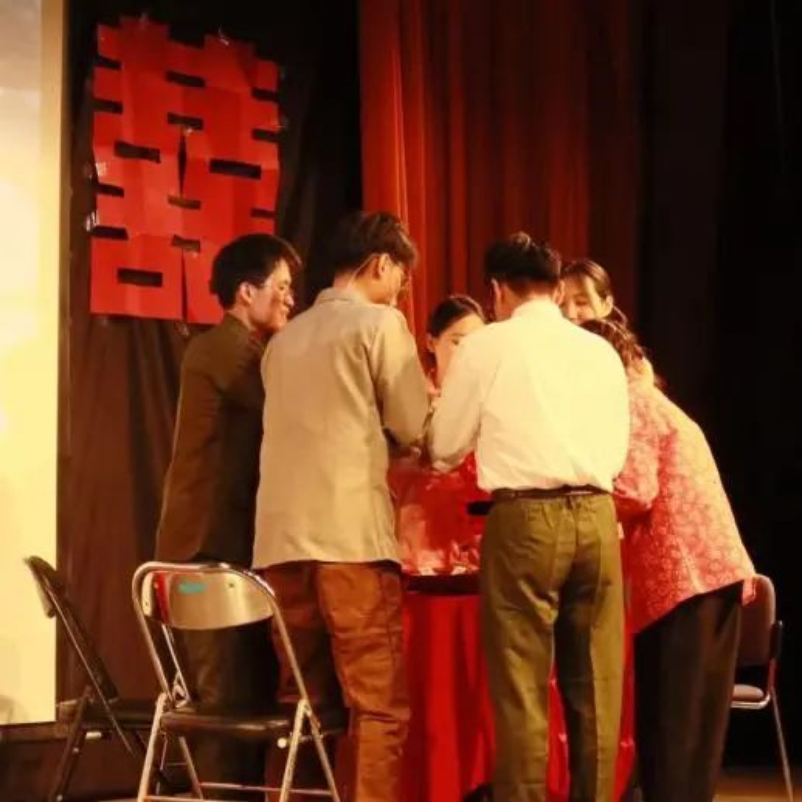 在婚礼上,裘卓越、马瑞德、刘柱、王桂兰、黄雅莉等员工都来为老师送上真挚的祝福。在现场高老师和杜老师还热情地为各位观众分发“喜糖”,整个剧场都沉浸在一片欢声笑语之中。