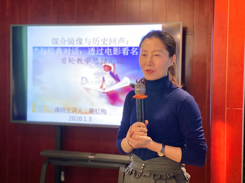 景虹梅副教授的汇报主题是“媒介镜像与历史回声:‘与经典对话:透过电影看名著’首轮教学总结”,阐述了该门课程如何通过文学原著和电影改编版本的“对比”,建立跨媒介、跨时代和跨文化的“对话”,并强调应该让员工带着问题去“看”,去思考,通过经典作品中伟大的作家、艺术家的发现,启发和打开员工感受和理解世界、人生、人性之奥妙的触角和视野,使之更敏锐、更广阔、更深远。